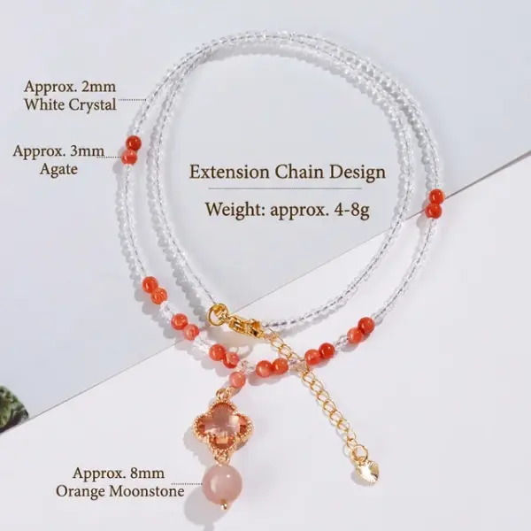 - Stones: Clear Quartz (2mm) + Agate accents (3mm) + Orange Moonstone drop (8mm)