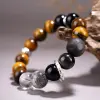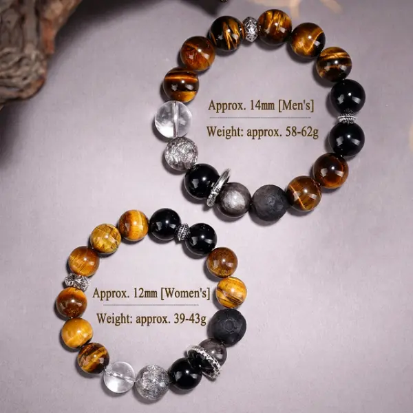 - Bead sizes (as shown): Tiger’s Eye ~11mm; black beads ~11mm; clear bead(s) ~12mm (plus a smaller accent bead around ~8mm)